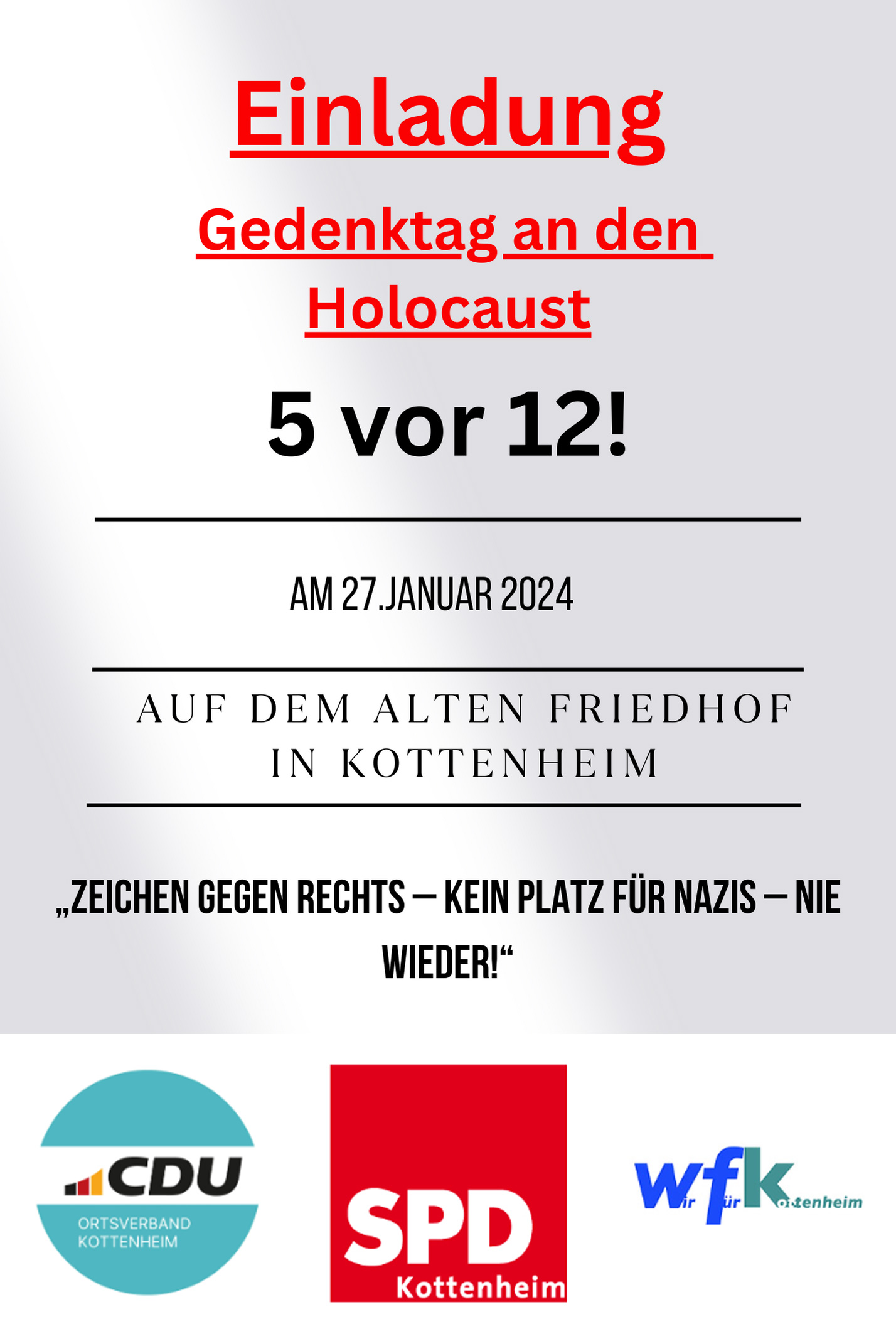 2002 beschloss der Europarat den 27. Januar als Tag des Gedenkens an den Holocaust und der Verhütung von Verbrechen gegen die Menschlichkeit einzuführen. Aktuell lösen die Meldungen zu konspirativen Treffen von Rechtsextremisten in Potsdam bei vielen Mitbürgern Bestürzung aus. Zum Gedenken an die Holocaust-Opfer und zum Protest gegen Rechtspopulismus laden alle Fraktionen des Ortsgemeinderates für Samstag, 27. Januar um Fünf vor Zwölf auf den alten Friedhof, Schulstraße ein: „Zeichen gegen rechts – kein Platz für Nazis – nie wieder“.